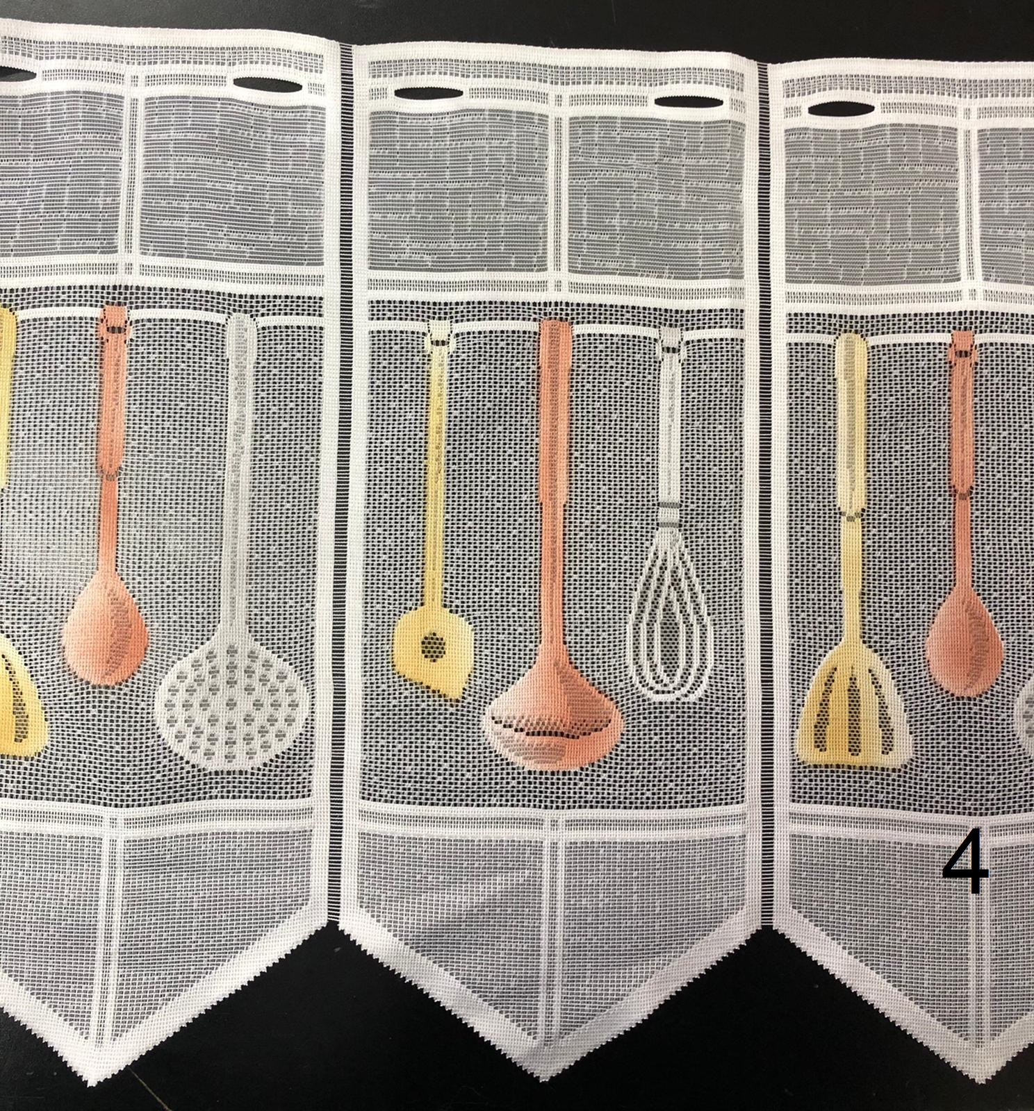 תיאור: וילון השחלה דמוי פשתן בדוגמאות מטבח צבעוניות. ניתן לקבל כבד גזור או וילון תפור לפי מידה (יחס כיווץ מומלץ: פי 1.5-2 מגודל החלון).