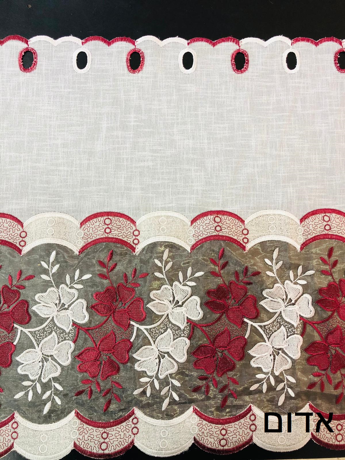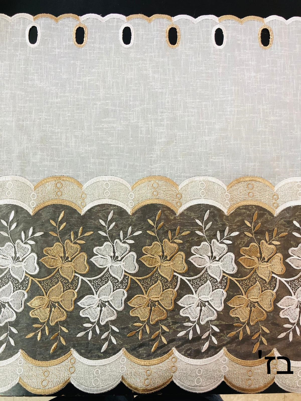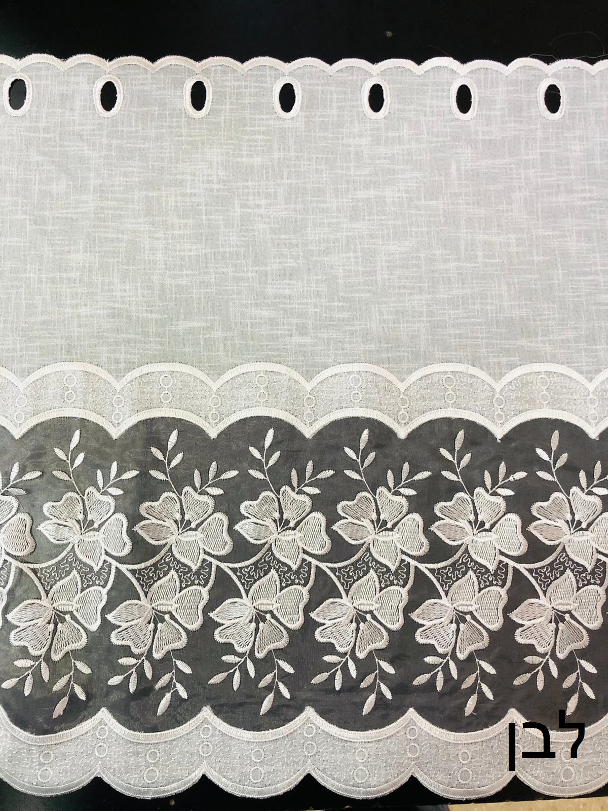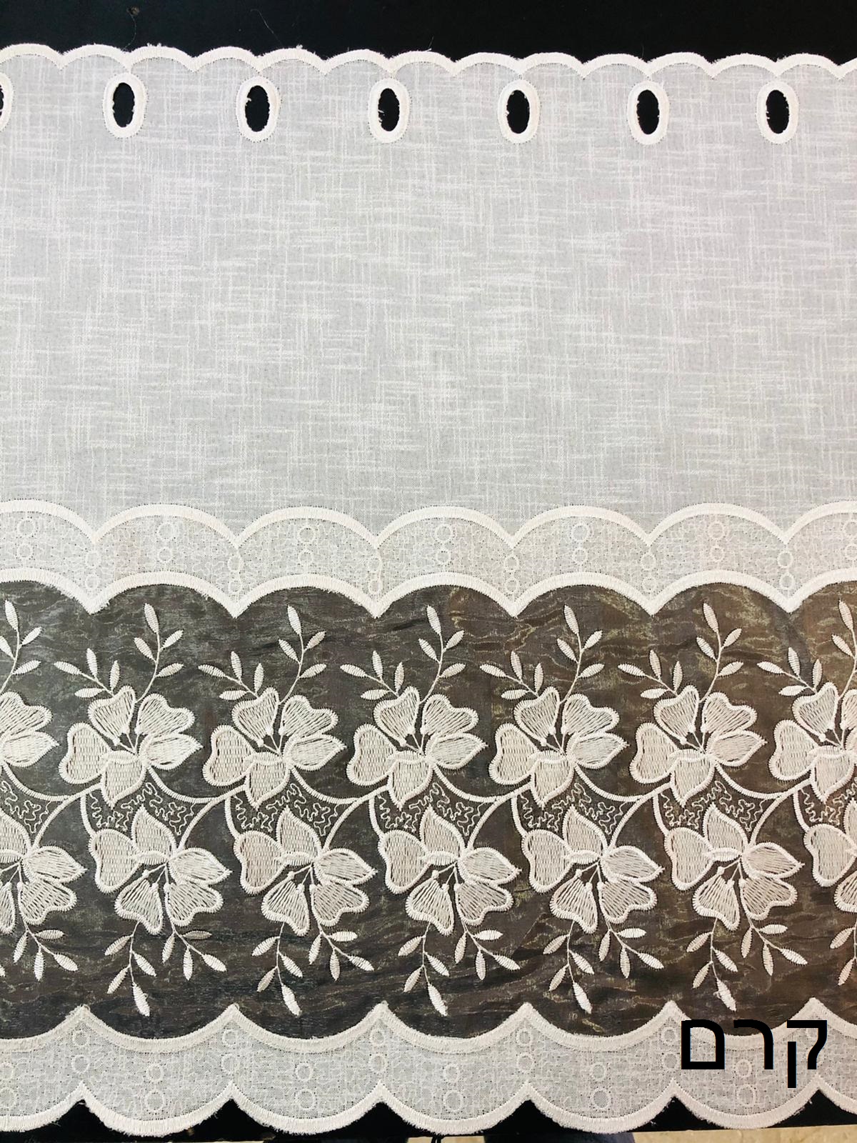תיאור: וילון השחלה דמוי פשתן עם רקמה וגימור אורגנזה שקופה בדוגמאת פרחים עדינה. ניתן לקבל כבד גזור או וילון תפור לפי מידה (יחס כיווץ מומלץ: פי 1.5-2 מגודל החלון).